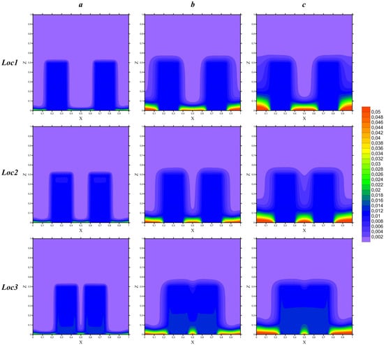 Figure 20 shows the spatial temperature distributions, showing the region’s growth with high temperatures behind the fins at their maximum convergence. The bevels of the end sides are observed only at the Loc2 position, which indicates its efficiency prevailing over the rest of the locations.