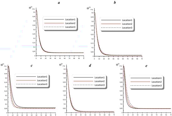 Figure 19 shows the time profiles of the average heater and fin temperatures (a and b, respectively). At a steady state, the effect of the position is insignificant. The maximum average heater temperature corresponds to the position of Loc1, which is 0.03478. Additionally, the minimum temperature is observed at Loc3, which is 0.033154. It is worth paying attention to the components of this figure. The most valuable results due to the purpose of this study are the control and reduction in the general heater temperature and the area under the ribs in particular. Figure 19d shows profiles of this temperature. The best cooling of the energy source corresponds to Loc2, while in Loc3, an increase of 12% is observed.