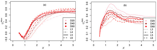 Figure 5 shows changes in the mean streamwise velocity , the root mean square (RMS) of the streamwise , the cross-stream , and the spanwise velocities, recorded between the downstream edge of the cylinder () to . As expected, convergence can be mainly observed in Figure 5a–c, where the dotted and dotted-dashed lines (L3 and L4) differ more from L5 and L6. The narrowness of the mesh seems to have stronger effects in the spanwise direction Figure 5d, where the flow disturbances also converge but to a different curve, depending on the depth of the array. So, it can be deduced that the flow is more restricted along the z-axis for the narrowest arrays, which could cause the lower variations observed. In turn, the RMS of the streamwise direction Figure 5b shows some discrepancies of about dimensionless units between and , when passing from D40L5 and D60L5 to D40L6 and D60L6. Although it is a relatively small difference, we did not find a clear physical-computational cause for this effect, so it could also be associated with narrowness, as suggested by other authors, for example those mentioned in Section 3.1.2.