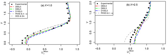 Turbulence was also analyzed along the flow direction (x) in its central line , and in the transverse direction (y) along four separate lines: 1, 2.5, 4, and 6, by referring to the streamwise and cross-stream velocities. The results were compared with the experimental data reported by [8] as well as with some available simulations performed with the PANS & k- model by [24], with the VLES and k- model [1], and by [19], who used a similar approach to that proposed in our work: the DES and SA model, but quadrupling the number of cells of D100L5.