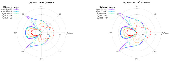 Maps of the averaged coefficient pressure () around the cylinder for six study cases, noting the five dimensionless taxicab perimeters enclosing it: , , , , .