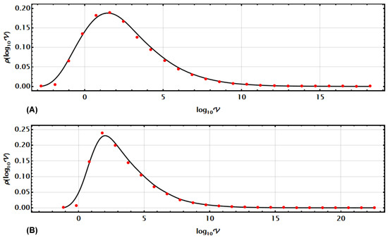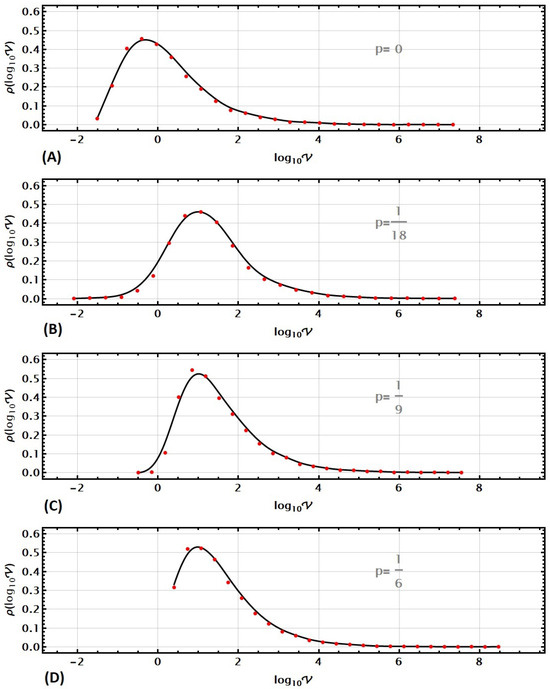 To illustrate this fact, we have obtained for the uniparametric sub-family of Pauli channels characterized by and (it was still calculated under the multiparametric approach for those channels), considering a random sample of size sets of selectable parameters on to numerically reach the statistical distribution for . Values of were grouped on 25 subsets of equal size on the obtained data range. The outcomes are shown in Figure 3 for (A) , (B) , (C) , (D) , (E) , (F) , (G) . Red dots correspond to the class mark and the black solid line is a spline fitting of order 6. Each plot is limited to the obtained data range in each case and then represented in the same interval to ease the comparison. Note, for , that the peak of the distribution is displaced on the right respect to those cases for . Although the sample could not contain the lowest possible values, this analysis shows the expected behaviour, the presence of values near zero drops to zero dramatically for .