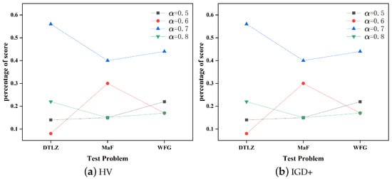The purpose of adjusting RVs at a later stage is to improve the search capability of the algorithm so that it can perform well when dealing with more complex problems. The timing of adjusting the RVs needs to be determined, i.e.,  in Algorithm 1. This parameter plays a critical role in affecting the algorithm’s performance. We have tested different values to investigate the impact on algorithm’s performance so as to determine the optimal value. It should be noted that the accuracy of the region explored by our algorithm in the early stage affects the effectiveness of the RV adjustment in the later stage. The algorithm should explore all the promising areas as much as possible in the early stage. That said, we do not suggest starting the adjustment of RVs too early. Therefore, we tested the performance of the algorithm when  = 0.5, 0.6, 0.7, and 0.8. For each different value of , one point is added whenever they achieve the best performance in a test problem; eventually, we counted the percentage of their scores in each category of test problem and plotted a line graph, where the higher the line, the better the performance of the parameter. As shown in Figure 9, the algorithm performs best when  = 0.7. Hence, we recommend using  = 0.7 in this paper.