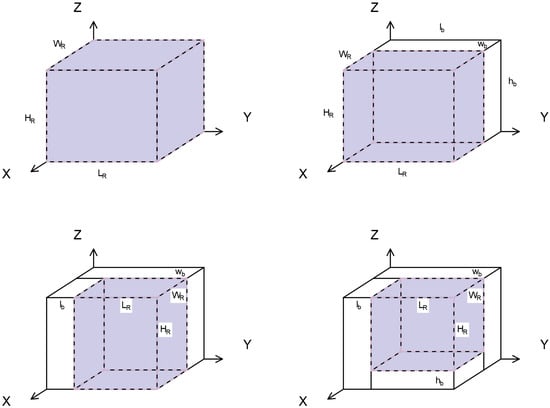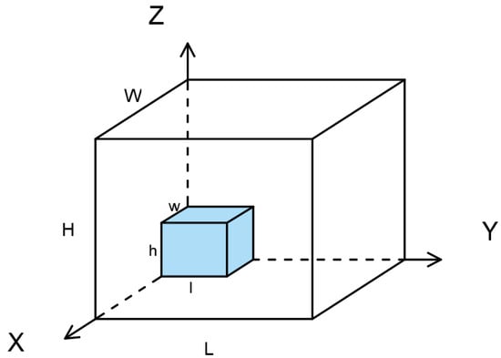 The item wall is placed adjacent to one side of the remaining space. After each placement of the item wall, the remaining space is redefined based on the boundaries of the item wall and the container, and its size changes according to Equation (7):