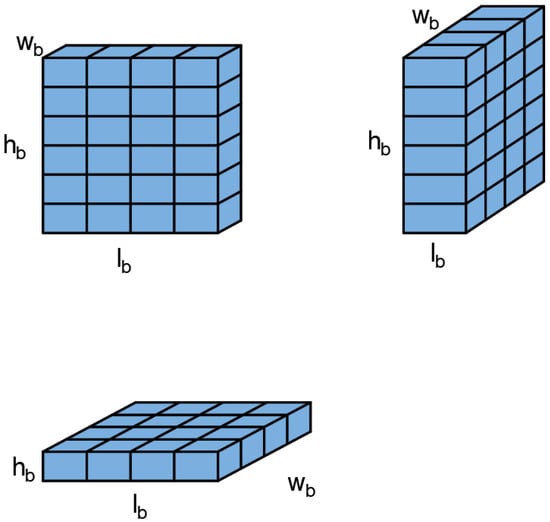 The item wall (refer to Figure 2) is formed by stacking items of the same type in a specific orientation simultaneously, denoted as B. Its dimensions can be expressed as in Equation (4):