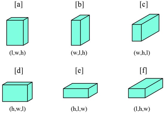 The schematic diagram of the orientations of item placement. (a–f) diagrams represent the six orientations of the cargo in three-dimensional space.