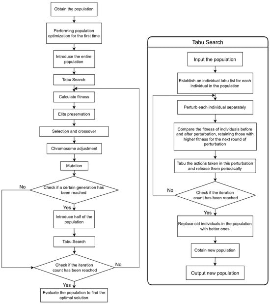 Compared to genetic algorithms, the tabu search algorithm demonstrates stronger local search capabilities, enabling exploration within the neighborhood of local optima and preventing entrapment in them by introducing a tabu list. Therefore, integrating tabu search as a local search algorithm to complement genetic algorithms as global search algorithms can enhance search diversity and facilitate rapid convergence.