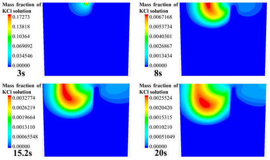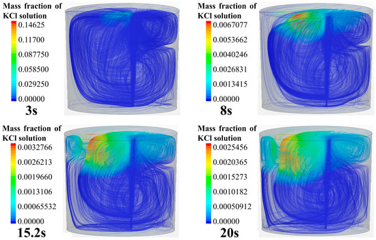 where is the mass fraction of the overall KCl solution in the computational domain. When tracers were introduced through the top inlet of the water model = 1, that meant the cell was filled with tracer [123]. When tracer addition stopped, = 0, that meant the cell was filled with water. Note that this equation is not the chemical concentration of KCl solute but rather the mass fraction of KCl solution in the cell and will be shortened as “mass fraction of KCl solution” in later sections. The effective diffusion coefficient is the sum of the molecular diffusion coefficient and turbulent diffusion coefficient, as follows.