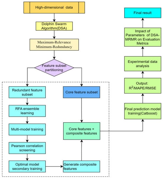 This study proposes an enhanced feature engineering model (EFEM) that effectively addresses the key challenges in high-dimensional regression tasks, including local optimal convergence and inefficient redundant feature processing. The model achieves this by integrating the Dolphin Swarm Algorithm (DSA) with the Maximum Relevance–Minimum Redundancy (mRMR) method. EFEM contains the following two major innovations: (1) the DSA–mRMR algorithm, which uses a dynamic fitness function to optimize feature selection and balance feature relevance and redundancy, and (2) a developed feature construction algorithm that employs an ensemble learning strategy to fuse redundant features and generate more discriminative synthetic features. Finally, the model combines the optimal feature subset with the synthetic features to further improve prediction performance.
