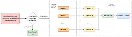 Traditional feature selection methods, such as filters, wrappers, and embedded methods, typically reduce data dimensionality and improve model efficiency by eliminating redundant or low-information features based on their correlation or importance to the target variable. However, these methods have a key limitation: features marked as “redundant” are not completely useless, but may contain supplementary information or potential patterns indirectly related to the target variable. Directly discarding these features may lead to information loss, especially in high-dimensional or complex scenarios, where the synergistic effect of features may significantly affect model performance [,,].