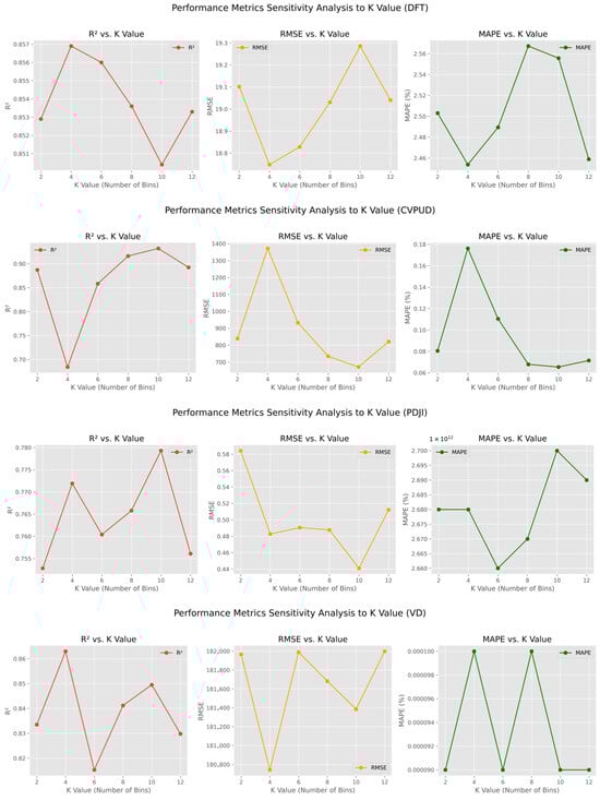Analysis on the DFT dataset, as a representative subplot in Figure 5, visually confirms this robustness. The curves for , , and  show that while performance varies slightly as K increases, the overall trend remains strong. Specifically, the  value remains consistently high, while the  and  values stay low across different K values. This further validates that the algorithm’s performance is not overly sensitive to the choice of K and can maintain stability in a variety of scenarios.