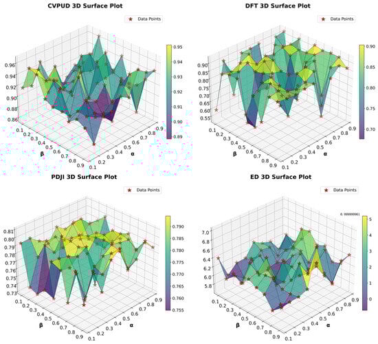 The 3D surface plot shown in subfigure (PDJI 3D Surface Plot) clearly illustrates the results of a parameter sensitivity analysis of the EFEM on the PDJI dataset. The horizontal axis () represents the balance coefficient between feature relevance and redundancy, the vertical axis () represents the regularization strength during dimensionality reduction, and this axis quantifies the model performance index (ranging from 0.1 to 0.81). The results indicate that surface fluctuations are primarily due to the following mechanisms: nonlinear coupling between parameters, with the model achieving an optimal performance when  and , and performance degradation caused by suboptimal parameter combinations (minimum 0.7).
