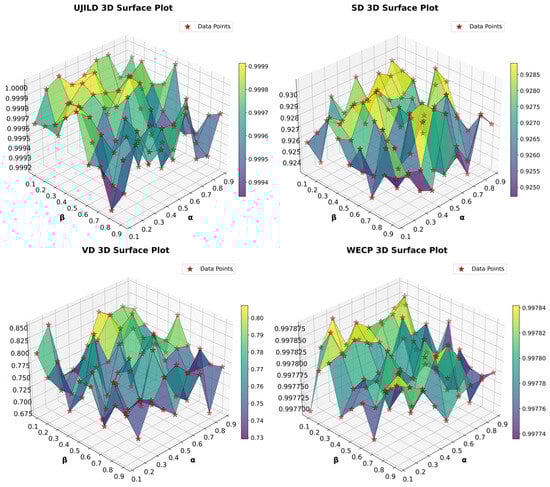 Under these conditions, the feature subset effectively retains highly informative features while suppressing redundancy. The surface plot exhibits a distinct peak at  = 0.5 and  = 0.2, demonstrating the synergistic effect of the mRMR criterion and the dimensionality reduction penalty. Conversely, when  > 0.7 or  > 0.5,  sharply declines, indicating that overemphasizing relevance or dimensionality reduction leads to information loss. These results confirm the sensitivity of parameter selection and provide quantitative guidance for parameter tuning in practical applications.