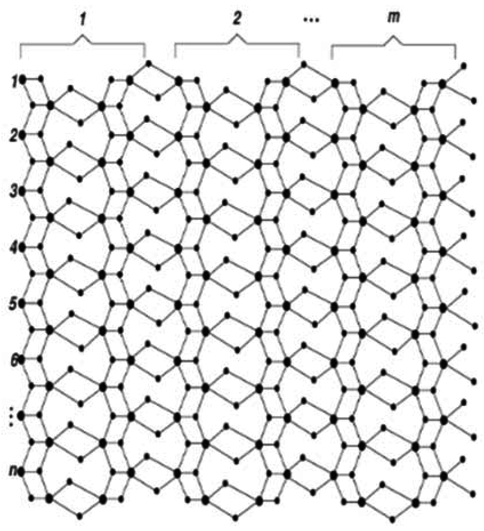 is the two-parametric chemical graph of a six-layered single-walled titania nanotube, where m and n represent the number of titanium atoms in each column and row, respectively (Figure 2). Here again, big dots correspond to titania atoms, small dots to oxygen, and edges to atomic bonds.
