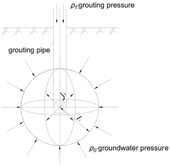 In Figure 1,  is the grouting pressure;  is the groundwater pressure at the grouting point;  is the penetration and diffusion radius of time-dependent power-law fluid after t time; and  is the radius of the grouting pipe.