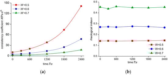 The following can be understood from Table 1 and Figure 3: (1) pure cement grouts with water–cement ratios of 0.50, 0.60, and 0.70 are power-law fluid, which confirms previous research results [,,]; and (2) the consistency coefficient increases exponentially with time and has typical time-dependent laws, while the rheological index does not change much with time and does not have time-dependent characteristics.