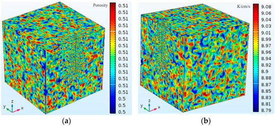 Distribution of porosity and permeability coefficient of gravel soil simulated by the model ((a) Porosity distribution, dimensionless, (b) Permeability coefficient distribution K/cm/s).