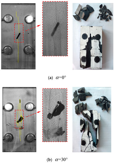 For the specimen in Figure 6c, apart from the wing cracks and anti-wing cracks that were observed around the pre-existing flaw, a long crack propagating parallel to the vertical compression direction was also observed. Small cracks branch from the main crack. Similar to the specimen, the specimen finally breaks into large blocks, small blocks, and debris. The number of cracks reaches a maximum value when , as shown in Figure 6d. Most of the cracks develop along the vertical bedding layers. The broken specimen mainly consists of slender blocks.