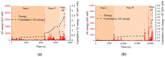 Knill et al. [36] described AE parameters, including amplitude, AE energy, and AE count in their study. AE energy can be determined by integrating the voltage record with time. Compared with the AE count, AE energy is more suitable for evaluating the magnitude of the activities of cracks due to its sensitivity to waveform amplitude and duration [37].