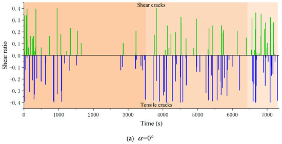 Figure 12 shows the time series of the shear ratio. For shear microcracks, the shear ratio () is minus 0.6. For tensile microcracks, the shear ratio () is minus 0.4. The mathematic operation aims at making the shear ratios of the shear/tensile microcracks distribute symmetrically around the time-axis. Figure 13 shows the statistical quantity ratio of the shear/mixed/tensile components in each specimen.