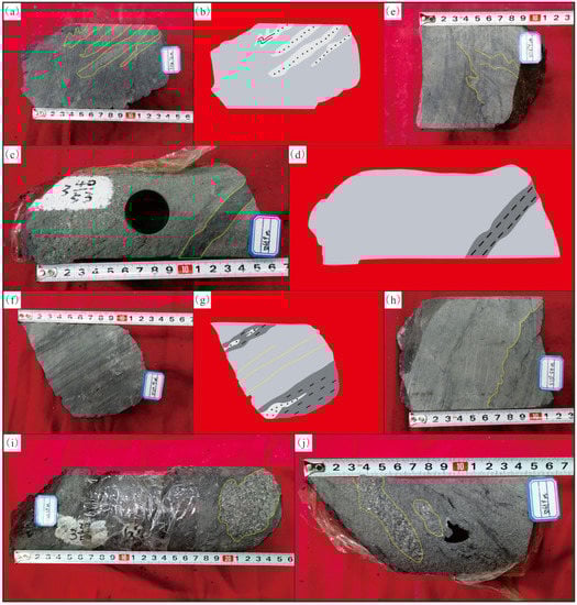 Soft-sediment deformation structures in the Carboniferous formation of the Shibei sag. (a) Well ZB6: well depth 5112.73 m, liquefied sandstone veins; (b) Well ZB6: well depth 5112.73 m, sketch of liquefied sandstone veins with the same region as (a); (c) Well ZB6: well depth 5066.90 m, liquefied mudstone vein; (d) Well ZB6: well depth 5066.90 m, sketch of liquefied mudstone vein with the same region as (c); (e) Well ZB6: well depth 5113.92 m, liquefaction crinkled deformation structure; (f) Well ZB6: well depth 5104.91 m, ball–pillow structure; (g) Well ZB6: well depth 5104.91 m, sketch of ball–pillow structure with the same region as (f); (h) Well ZB6: well depth 5110.54 m, flame structure; (i) Well ZB6: well depth 5066.39 m, liquefaction breccia; (j) Well ZB6: well depth 5066.90 m, liquefaction breccia.