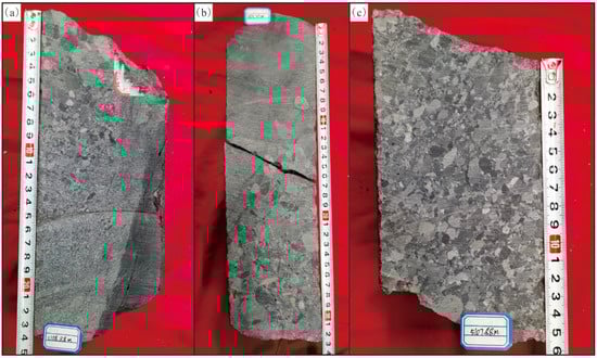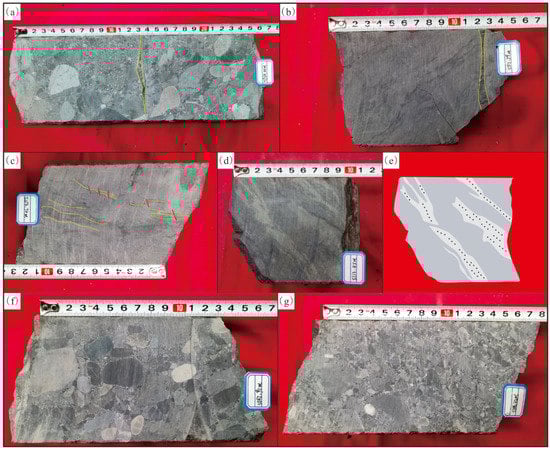 These rocks were formed under strong seismic action during the diagenetic contemporaneous period and are often associated with seismic fractures []. In the study area, the tuffaceous conglomerate pebbles are well rounded, mostly supported by grains, and some pebbles are partially broken. Calcite veins cut through or surround the pebbles (Figure 3f,g), a formation called the molar tooth structure [].