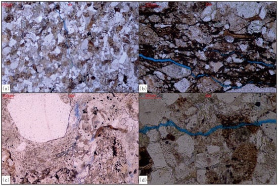 Seismite reservoirs are significantly affected by vibration compaction. Through microscopic observation, it can be found that the particles have slipped, displaced, rearranged, and undergone plastic deformation and even brittle fracture. Microfractures have developed on the surface of quartz and feldspar particles (Figure 5a,b), and biotite is hydrated (Figure 5c). Microfractures, seismic fractures and liquefaction channels can connect pores (Figure 5a,b,d), which improve reservoir permeability []. At the same time, widely developed seismic fractures can be used as channel for fluid, thus enhancing dissolution around the fractures. Dissolution pores are mainly developed along the microfractures, indicating that the fluid used seismic fractures dissolving the surrounding feldspar particles, and to a certain extent, the permeability of the reservoir was improved. According to the actual measurement results, the porosity of the studied deposit is 1.9%–4.62%, with an average porosity of 2.95%, which is significantly improved compared with the matrix porosity.