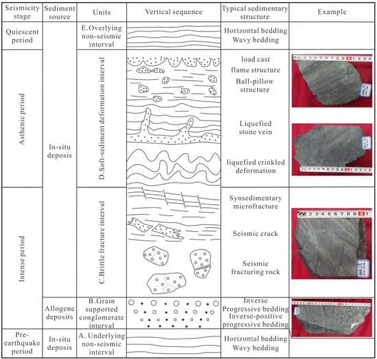 The development of seismites is associated with earthquakes, which can cause sliding, slumping, fragmentation and deformation of sediments []. Seismicity can generally be divided into four stages: pre-earthquake period, intense period, asthenic period and quiescent period. Sediment assemblages formed in different stages have certain rules in terms of vertical direction. In combination with the structural background and development characteristics of seismites in the Shibei sag, the vertical sequence of seismites was established, which can be divided into 5 intervals from bottom to top (Figure 6).