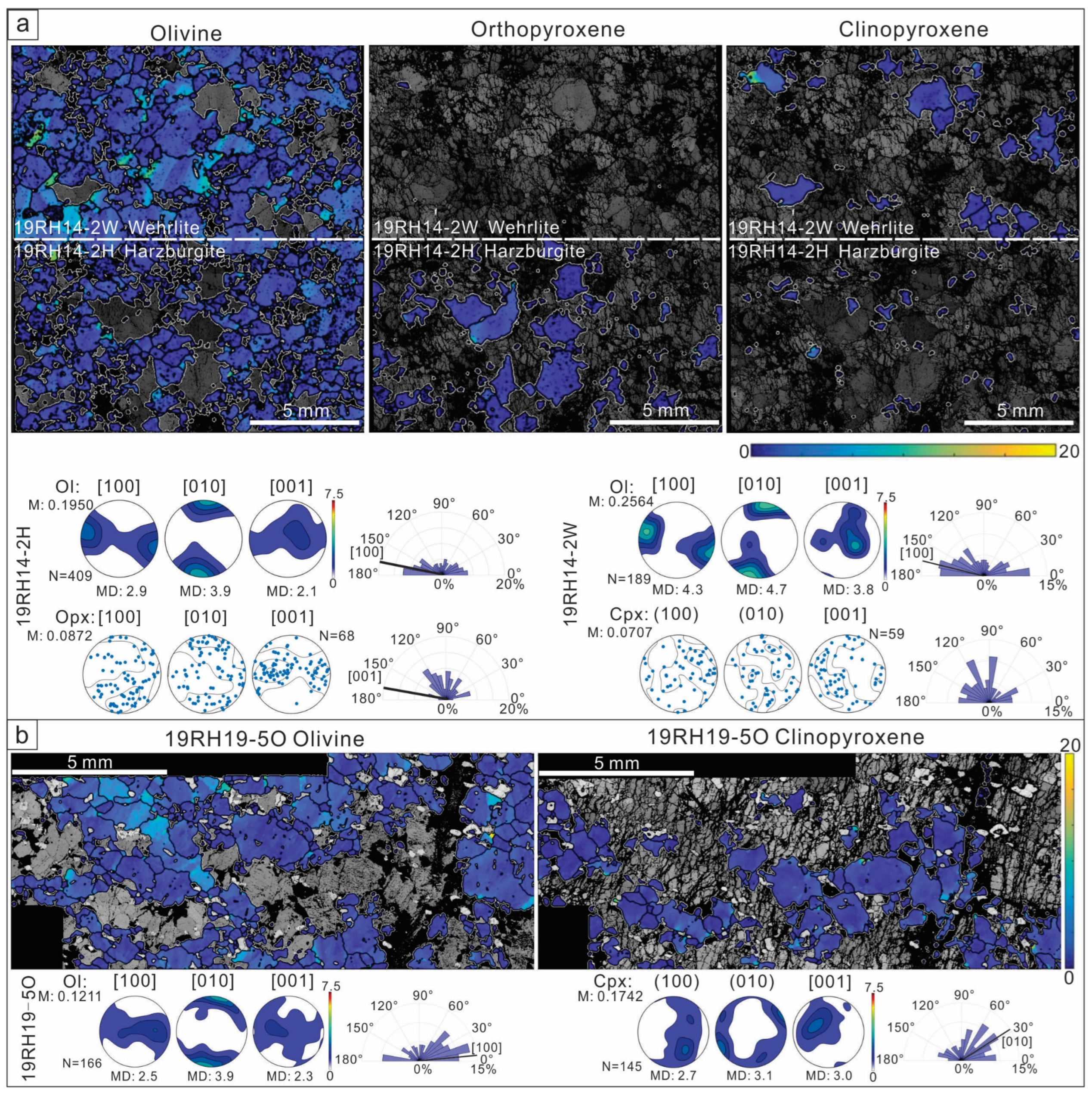 | Sample No. | Lithology | Ol (%) | Opx (%) | Cpx (%) | Sp (%) | Ol CPO Type | Ol Grain Size (μm) | Ol Grain Median (μm) | Ol M Index | BA Index | Cpx CPO | Cpx CPO Type | Cpx Grain Size (μm) | Cpx Grain Median (μm) | Cpx M Index | LS Index | Ol and Cpx Coherence a |