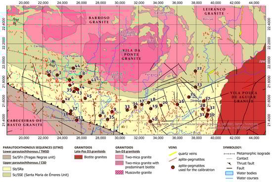 Geologic map of the Barroso–Alvão aplite-pegmatite field with the location of the pegmatites used for the LIBS calibrations (red dots). Coordinates system: ETRS 1989 Portugal TM06. Adapted from Rodríguez Fernández, et al. [], Agência Portuguesa do Ambiente [,], Sant’Ovaia, et al. [] and Ribeiro, et al. []. © Agência Portuguesa do Ambiente (APA). Available online: https://sniamb.apambiente.pt/content/geo-visualizador (accessed on 19 July 2022).