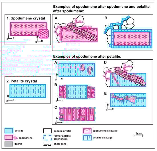 Currently, it is assumed that not all the aplite-pegmatites from the BA field are coetaneous []. At least two different pulses of crystallization have been recognized. Lithium-aluminosilicates (spodumene and petalite) have been found in aplite-pegmatites belonging to the two pulses, with different textural relationships among them. Three generations of spodumene and two of petalite have been found (Figure 2). The first generation of spodumene is primary (Figure 2, example 1) and occurs in the aplite-pegmatites crystallized during the first pulse. The associated pegmatitic melt was Sn-poorer and Fe-richer than the next pulse of melt that formed aplite-pegmatites containing primary petalite (Figure 2, example 2). These later aplite-pegmatites present a significant amount of cassiterite, which was mined for Sn during World War II. Now they are commonly found as old mining works that left narrow holes in the landscape in the place where the aplite-pegmatites outcropped. A second generation of petalite can also be found surrounding other minerals from the matrix of aplite-pegmatites, including primary spodumene [,] (Figure 2, example 1B). The second generation of spodumene is the spodumene and quartz intergrowths formed through the breakdown of the primary petalite (Figure 2, example 2A–C). Later, a third generation of spodumene (subsolidus) was formed favored by regional deformation and can be found in aplite-pegmatites belonging to the two pulses as alignments of fine aggregates of spodumene and quartz or acicular crystals of spodumene (<100 μm) growing around crystal contacts or crosscutting other crystals (Figure 2, example 1A and Figure 2, example 1D).