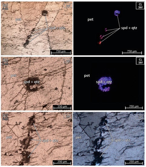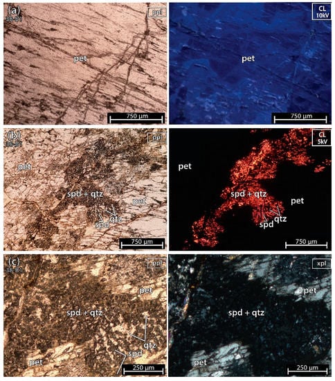 Microphotographs in parallel polarized light (ppl), crossed polarized light (xpl) and cold cathodoluminescence (CL) microscopy from a petalite (pet) fragment of the crystal sample 1 of the aplite-pegmatite 38 (38-B1). Although most of the sample is petalite, there is an alignment of spodumene (spd) and quartz (qtz) crosscutting the petalite crystal from one side of the thin section to the other. (a) petalite; (b,c) spodumene and quartz mixture crosscutting the petalite crystal.