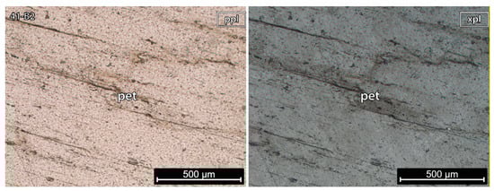 Microphotographs in parallel polarized light (ppl) and crossed polarized light (xpl) from a petalite (pet) fragment of the crystal sample 2 of the aplite-pegmatite 41 (41-B2). This is a pure petalite crystal without any traces of other minerals.