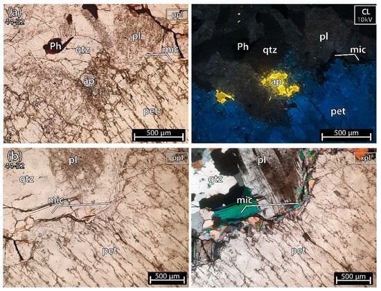 Microphotographs in parallel polarized light (ppl), crossed polarized light (xpl) and cold cathodoluminescence (CL) microscopy from a petalite (pet) fragment of the crystal sample 2 of the aplite-pegmatite 44 (44-B2), also known as Antigo. This sample contains a great amount of other minerals such as: (a) plagioclases (pl), quartz (qtz), Fe-Mn phosphates (Ph) and apatites (ap); (b), white micas (mic), plagioclases (pl), quartz (qtz).