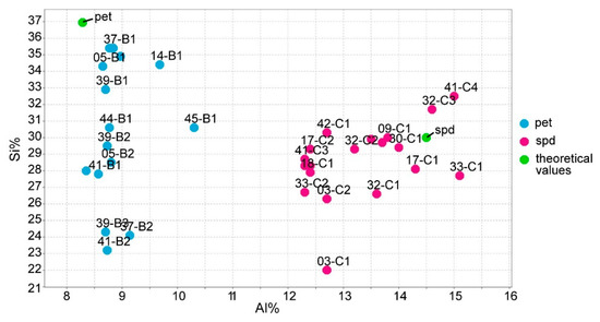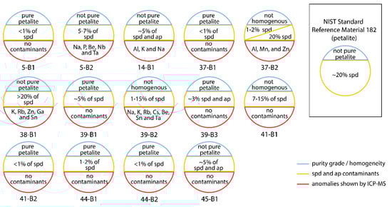 The Li, Si and Al contents of spodumene and petalite should be sufficient to distinguish both minerals if the analysis method has accurate results (unlike the Si from ICP-MS). However, it may be difficult to distinguish a petalite from fine mixtures of spodumene and quartz (often invisible to the naked eye in the BA field) if they have SQI proportions []. Thankfully, in nature, the minerals will hardly have this theoretical composition since minor substitutions commonly occur in their crystal structure. For example, spodumene crystals in nature always have some significant amount of Fe and/or Mn substituting some of the Al in their crystal structure. As for petalite, it is usually more difficult for other elements to enter its crystal structure, although it can also happen [,,].