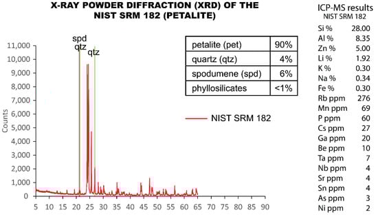 Since the visual estimation from CL seemed to indicate that the NIST SRM 182 (petalite) contained a large amount of spodumene (Figure 11), an analysis of X-ray diffraction (XRD) was performed in this SRM. The XRD results showed that approximately 90% was petalite, 6% was spodumene, 4% was quartz and that there was <1% of phyllosilicates (Figure 14).
