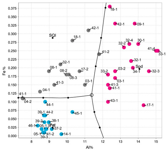 Differentiating spodumene from petalite and from spodumene + quartz mixtures based on the Al and Fe content from the ICP-MS analysis (graph made in the IoGas software with Auto-Domain tool from the analysis tab, with common covariance matrix, coarse accuracy, and no limit in the cutoff M distance). The pink dots are spodumene crystal samples, the grey are mixtures of spodumene and quartz samples and the blue are petalite crystal samples.