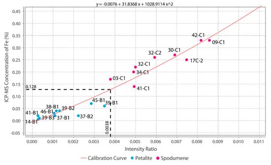 - The intensity ratios (IR) determined by dividing the total area of the peaks for one element by the total area of all the peaks in the spectra resulted in identical IRs for spodumene and petalite. This forced the creation of two calibration lines for each mineral for all the chemical elements, except for Fe, which was the only element with distinct IRs for both minerals. Thus, it was only possible to successfully distinguish and analyze spodumene and petalite because petalite had always more Fe than spodumene and IRs greater than 0.0038 (Figure 17);