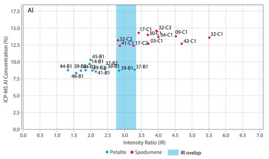 Overlap of the pLIBS Al intensity ratios for the spodumene and petalite samples of the Barroso–Alvão aplite-pegmatite field.