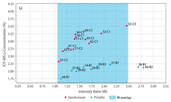 Overlap of the pLIBS Li intensity ratios for the spodumene and petalite samples of the Barroso–Alvão aplite-pegmatite field.