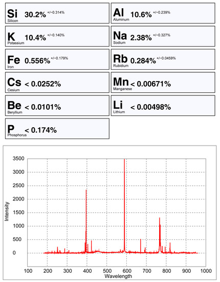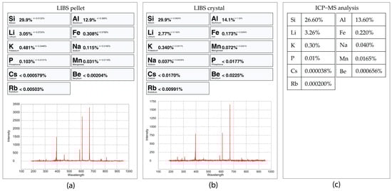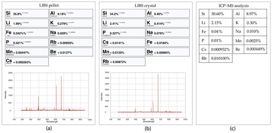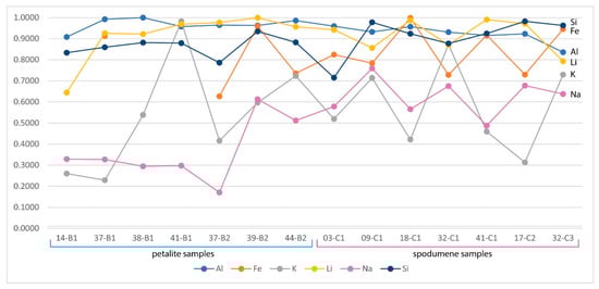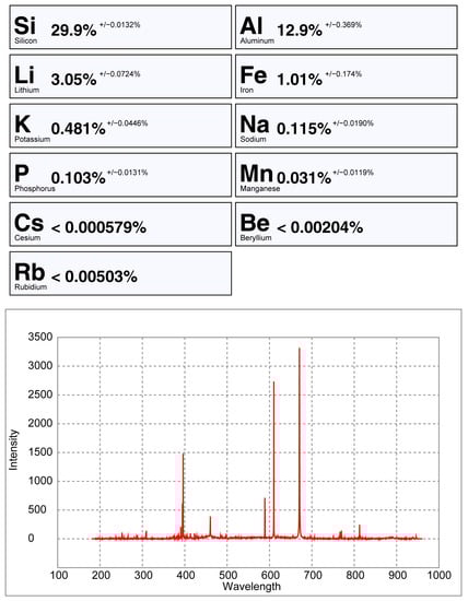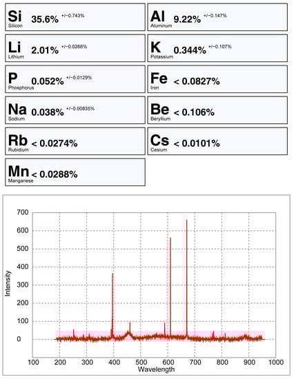 The presence of spodumene and quartz in the petalite samples could be a problem for the pLIBS equipment since this equipment can be very sensitive to changes in the matrix that can cause the spectra to change by altering the area of the peaks disproportionately to the element concentration []. Thus, these samples must be analyzed with extra precautions.