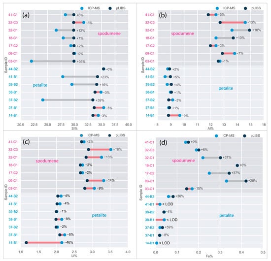LIBS accuracy compared to the ICP-MS analysis for the spodumene and petalite samples from the Barroso–Alvão aplite-pegmatite field.