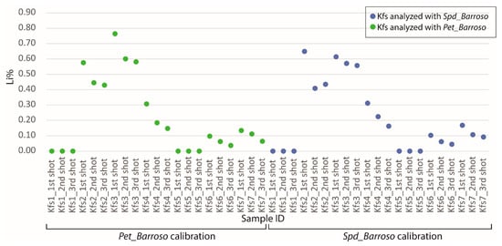Li results from the pLIBS by analyzing three times seven distinct potassium felspars (Kfs) with the Pet_Barroso (green dots) and the Spd_Barroso (blue dots) calibrations.