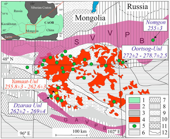 A geologic map of the mafic–ultramafic intrusions location within Khangai batholith (modified after [,]). 1—Central Asian orogenic belt (CAOB); 2—volcano–plutonic belt (SVVPB—Selenga–Vitim volcano–plutonic belt, GAVPB—Gobi–Altay volcano–plutonic belt); 3—Mesozoic–Cenozoic troughs; 4—Late Palaeozoic granitoids of the Khangai batholith; 5—Permian gabbros of the Khangai Mountains; 6–9—orogens: 6—Middle–Late Palaeozoic (Hercynides), 7—Early–Middle Palaeozoic (late Caledonides), 8—Vend–Early Palaeozoic (early Caledonides), 9—Neoproterozoic; 10—tectonic blocks with the Early Precambrian basement; 11—tectonic blocks with the Pre-Vend orogenic basement; 12—main tectonic boundaries. Red box—study area.