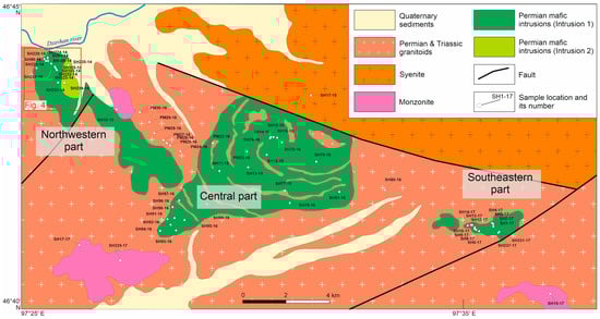 Intrusion 2 is composed of monzogabbro and occurs only in the Northwestern part of the complex; the samples SH234-14 and SH235-14 are involved (Figure 3e), which are marked by a red spot in the Eastern part on the magnetic anomalies map (Figure 4 b,c).