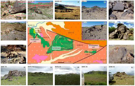 The boundaries of the Yamaat Uul mafic complex are mostly obscured by Quaternary sediments; outcrops of single round stones are mostly observed (Figure 3a–k). The complex’s rocks have intrusive contact with later Permo-Triassic granites in the Northwestern part (Figure 3a); gabbro of the Central part is intensely intruded by granite dikes (Figure 2). There are outcrops of syenite (Figure 3h) to the north of the Central part—the contact with which is also sodded. Outcrops of monzonite and monzodiorite (Figure 3j), probably of a later age than the rocks of the mafic complex, are found in various parts of the complex. In general, the Yamaat Uul complex is surrounded by granitoids of the Khangai batholith [] (Figure 3k).
