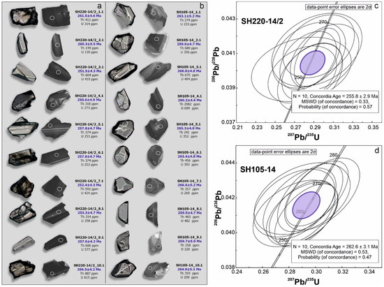 Zircon separation was conducted in the IGM SB RAS with a standard procedure of crushing, panning, heavy-liquid and magnetic separation techniques. Zircon grains were handpicked under a binocular and then mounted in a 6 mm epoxy resin disc. All grains were half-polished to observe the internal structure using cathodoluminescence (CL) and transmitted light. The CL imaging was conducted at the Centre of Isotopic Research of the Russian Geological Research Institute (VSEGEI) using the scanning electron microscope MX2500 S (CamScan, Great Britain, Cambridge) and operated at an accelerating voltage of 12 kV and working distance of 30 mm. The locations for the spot analysis on zircon grains were selected using CL images (Figure 6a,b) and photomicrographs (transmitted light) to avoid mineral inclusions and cracks. Zircons from the samples SH220-14/2 and SH105-14 were analysed for U–Pb ages at the VSEGEI, Russia, with a SHRIMP II, following the standard procedures described in []. Prior to each analysis, the rastering of primary beams was applied to minimize contamination by surface Pb. U–Pb ages and concordia diagrams were calculated and plotted using IsoplotR software (ver. 3.75; []), respectively; the concordia age of each sample incorporates errors on decay constants and includes evaluation of the concordance of apparent ages. The concordia ages and errors are presented at the two-sigma level. All analyses of zircons are given in Table 2.