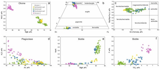 Chemical variation plots of olivine (a), clinopyroxene [] (b), amphibole [] (c), plagioclase (d) and biotite (e,f) from the studied rocks.