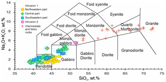 Classification diagram for rocks of the Yamaat Uul mafic complex and surrounding rocks (after []).