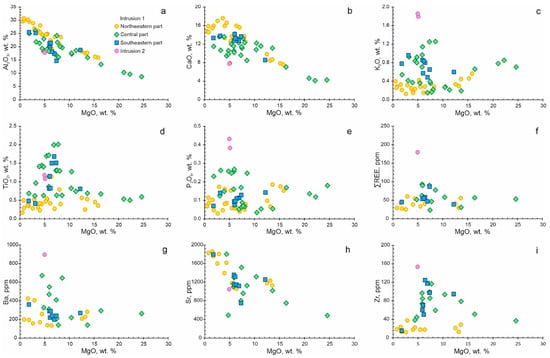 Monzogabbro is characterized by a high concentration of K2O, P2O5 and ∑REE: up to 1.87, 0.43 wt.% and 180 ppm, respectively, with 5 wt.% MgO content (Figure 9c,e,f). This is due to the accumulation of incompatible elements during the formation of the mafic complex and the appearance of K-Na feldspar in monzogabbro.